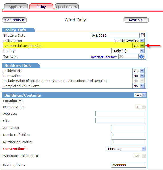 Answer the Commercial-Residential question Yes (the entry field is just beneath the Policy type entry field). This will allow a coverage limit higher than $1,000,000. The program will produce a Commercial Non-Residential application based on the Policy type, however Citizens does not place a limit of $1,000,000 on this type of risk as they do with a Commercial Non-Residential building such as an Office.